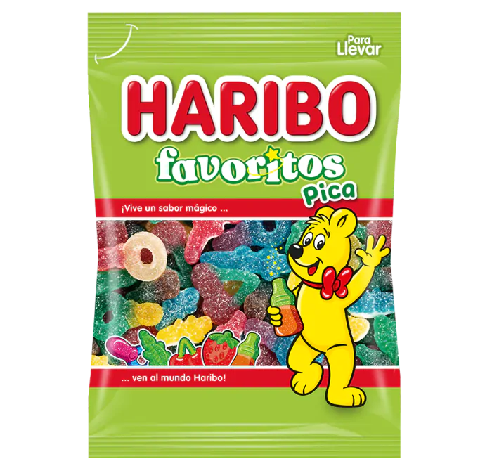 Bolsa de 100 g de gominolas Haribo Favoritos Pica, con formas variadas y un irresistible recubrimiento de azúcar ácida. Un clásico de Haribo para compartir y disfrutar en cualquier ocasión.