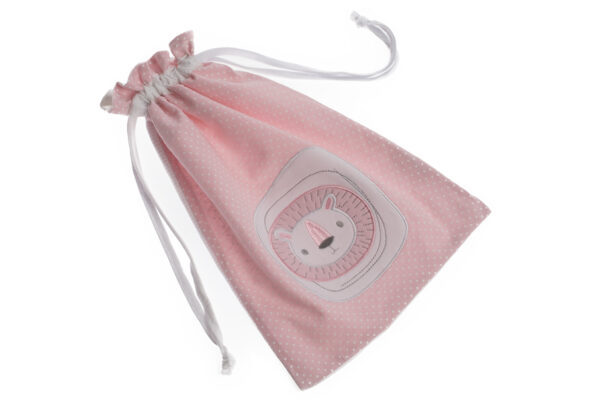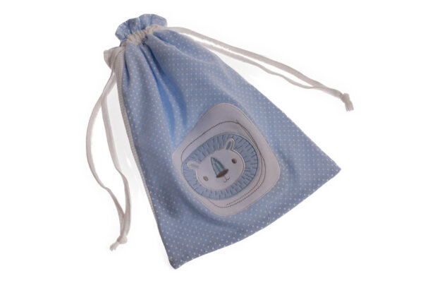 Bolsa de merienda con pequeños lunares con bordado “leon” , embalaje en bolsa , medidas 33×24 aproximadamente , marca Gamberritos. Dos colores Rosa o Azul.
