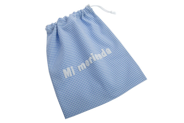 Bolsa de merienda con pequeños cuadritos, embalaje en bolsa,medidas 25×30, marca Gamberritos. Azul o Rosa
