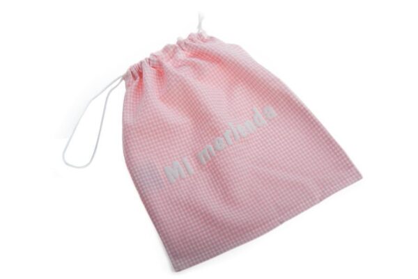Bolsa de merienda con pequeños cuadritos, embalaje en bolsa,medidas 25×30, marca Gamberritos. Dos colores Rosa y azul a elegir.