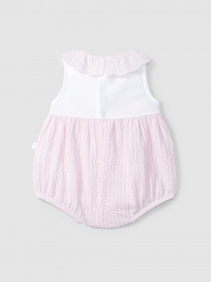 Parte superior en punto de algodón con cuello de volante y bordado exclusivo Laranjinha. Parte inferior en tejido seersucker a rayas. Cierre con broches en la espalda y entrepierna para mayor comodidad.