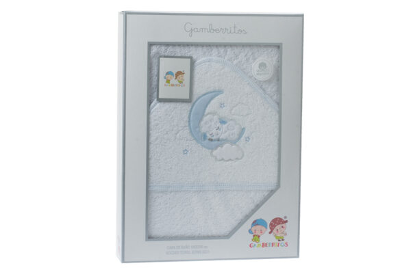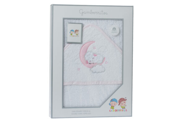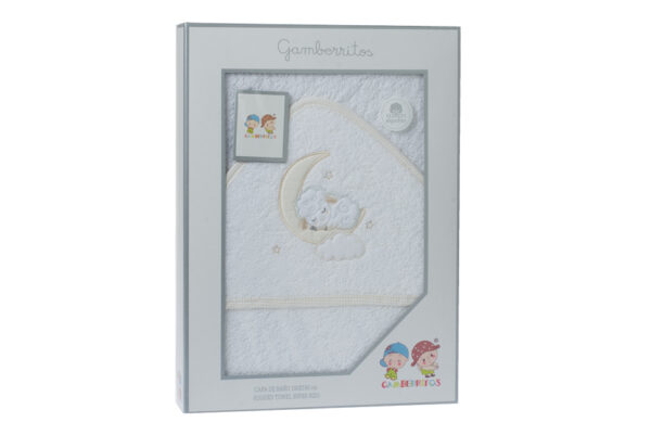 Les presento la encantadora capa de baño modelo Beatriz de Gamberritos, ¡la compañera perfecta para la hora del baño de tu pequeño tesoro! Imaginen a su bebé envuelto en esta suave y adorable capa, con un dulce dibujo bordado de una ovejita dormida sobre la luna. ¡Es una verdadera monada!