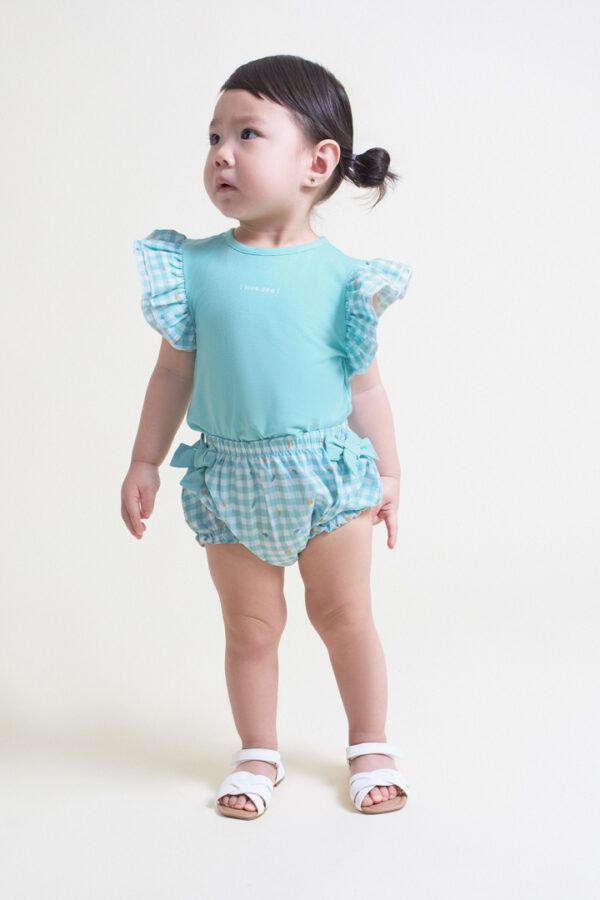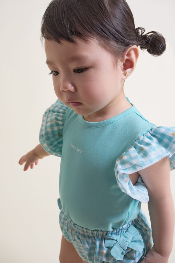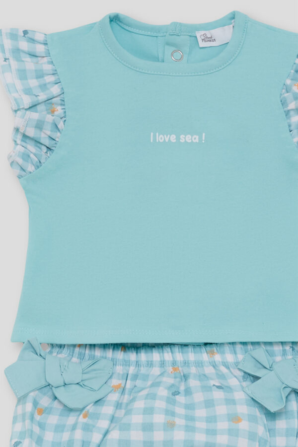La camiseta en color azul presenta un mensaje central “I love sea!” y volantes de cuadros vichy en las mangas, aportando un toque dulce, marinero y lleno de encanto al conjunto. Su diseño sin mangas permite libertad de movimiento y comodidad en los meses de calor, mientras que su tejido transpirable mantiene la piel del bebé suave y fresca.
