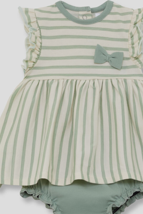 La camiseta en color crudo presenta finas rayas en verde medio, detalle de volantes en los hombros y un lazo decorativo en el pecho, aportando un toque dulce y femenino. Las tallas de meses cuentan con cierre trasero, facilitando el cambio de la prenda.