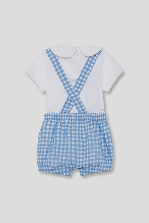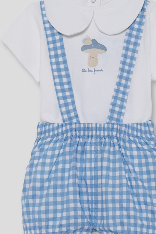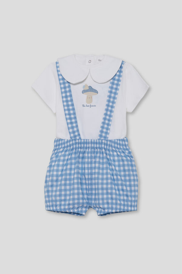 Conjunto para bebé niño Street Monkey con camiseta blanca con cuello bebé y estampado de seta, y ranita vichy azul con tirantes cruzados y cintura elástica. Diseño ligero, cómodo y fresco, ideal para verano. Disponible de 1 a 24 meses.
