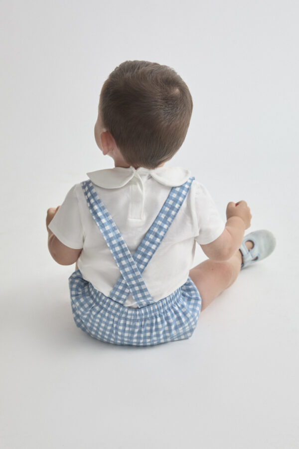 La ranita de cuadros vichy en color azul completa el look con un diseño atemporal y encantador. Cuenta con tirantes cruzados en la espalda y cintura elástica, proporcionando un ajuste cómodo y seguro, además de facilitar la libertad de movimiento del bebé.