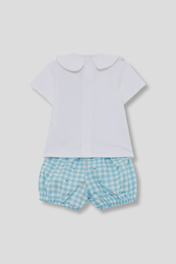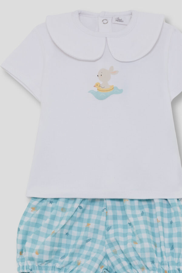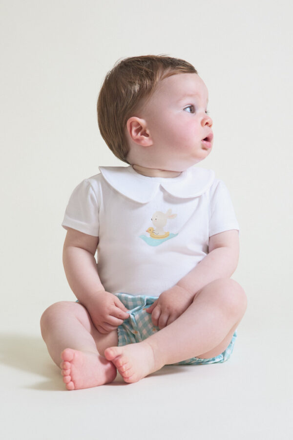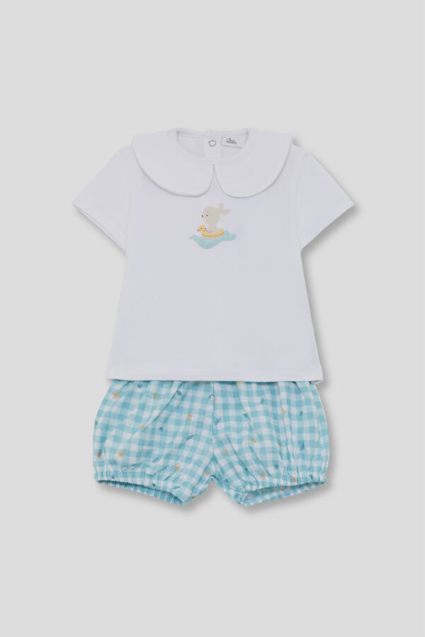 Conjunto para bebé niño Street Monkey con camiseta blanca con cuello bebé y estampado de conejito con flotador, y braguita vichy turquesa con elásticos. Diseño ligero, cómodo y fresco, ideal para verano. Disponible de 1 a 24 meses.