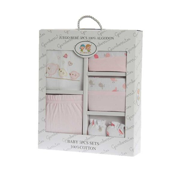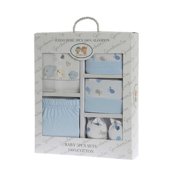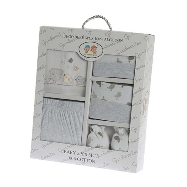 Juego infantil 5 prendas 10735. Este pack está disponible en diferentes colores: Azul, gris y rosa. Este accesorio es de uso indispensable para el bebé en sus primeros meses de vida. Están estampados diversos detalles e ilustraciones sobre el tejido generando un divertido y llamativo diseño. Para bebé niña y bebé niño.