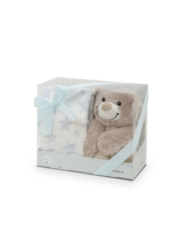 Preciosa manta aterciopelada muy suave y calentita con diseño de topos en relieve y medida de 80×110 más un muñeco en forma de osito con un aro de madera para que tú bebé se entretenga mordiéndolo, agarrándolo y tocándolo. Todo ello confeccionado en 100% poliéster de la mejor calidad y presentado en caja para regalo.