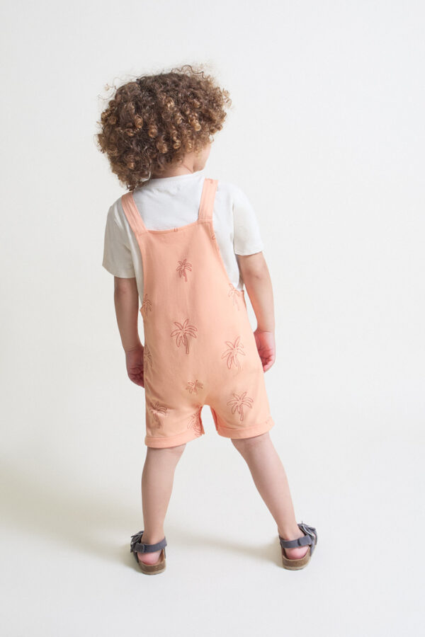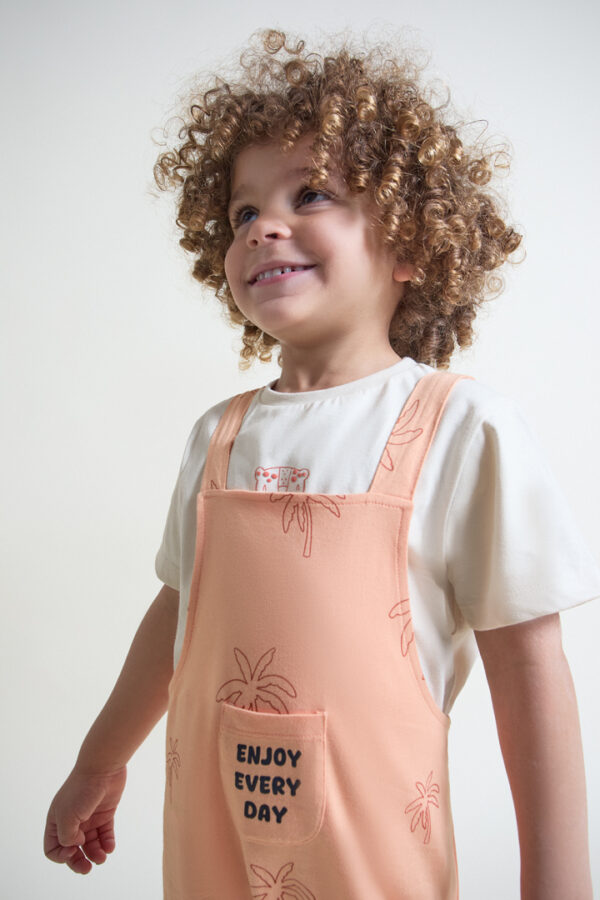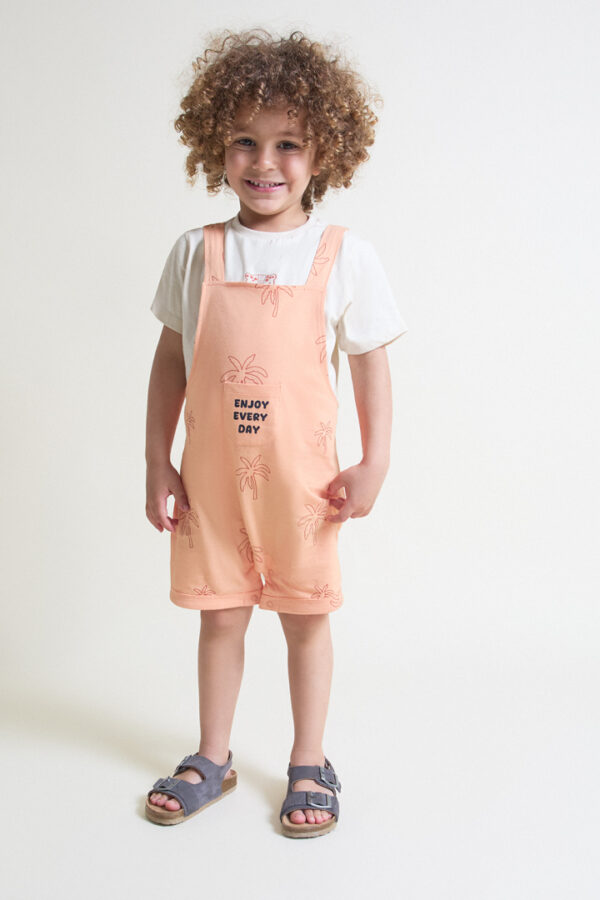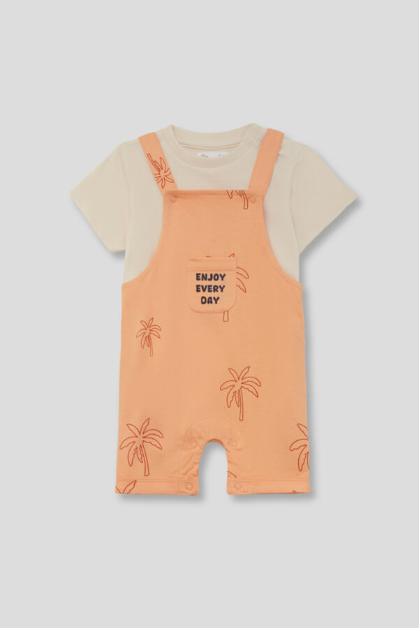 Conjunto de dos piezas para bebé niño de Street Monkey con camiseta cruda de manga corta y peto corto naranja con estampado de palmeras y bolsillo con bordado “Enjoy every day”. Con cierre en la entrepierna, es cómodo y ligero, ideal para verano. Disponible de 3 meses a 6 años.