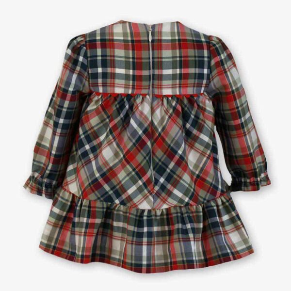 Vestido para bebé niña de Miranda Textil, modelo 380512V. Diseño clásico de cuadros escoceses en tonos rojo, verde y beige, con lazada lateral en terciopelo rojo. Confeccionado en tejido suave y ligero, ideal para la temporada otoño–invierno.