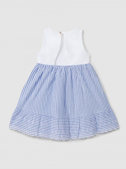 Este vestido para bebé niña de Laranjinha combina elegancia y comodidad en un diseño cuidado y delicado. Su parte superior en punto de algodón se une a una falda en tejido seersucker a rayas, creando una prenda fresca y con volumen ideal para el verano.